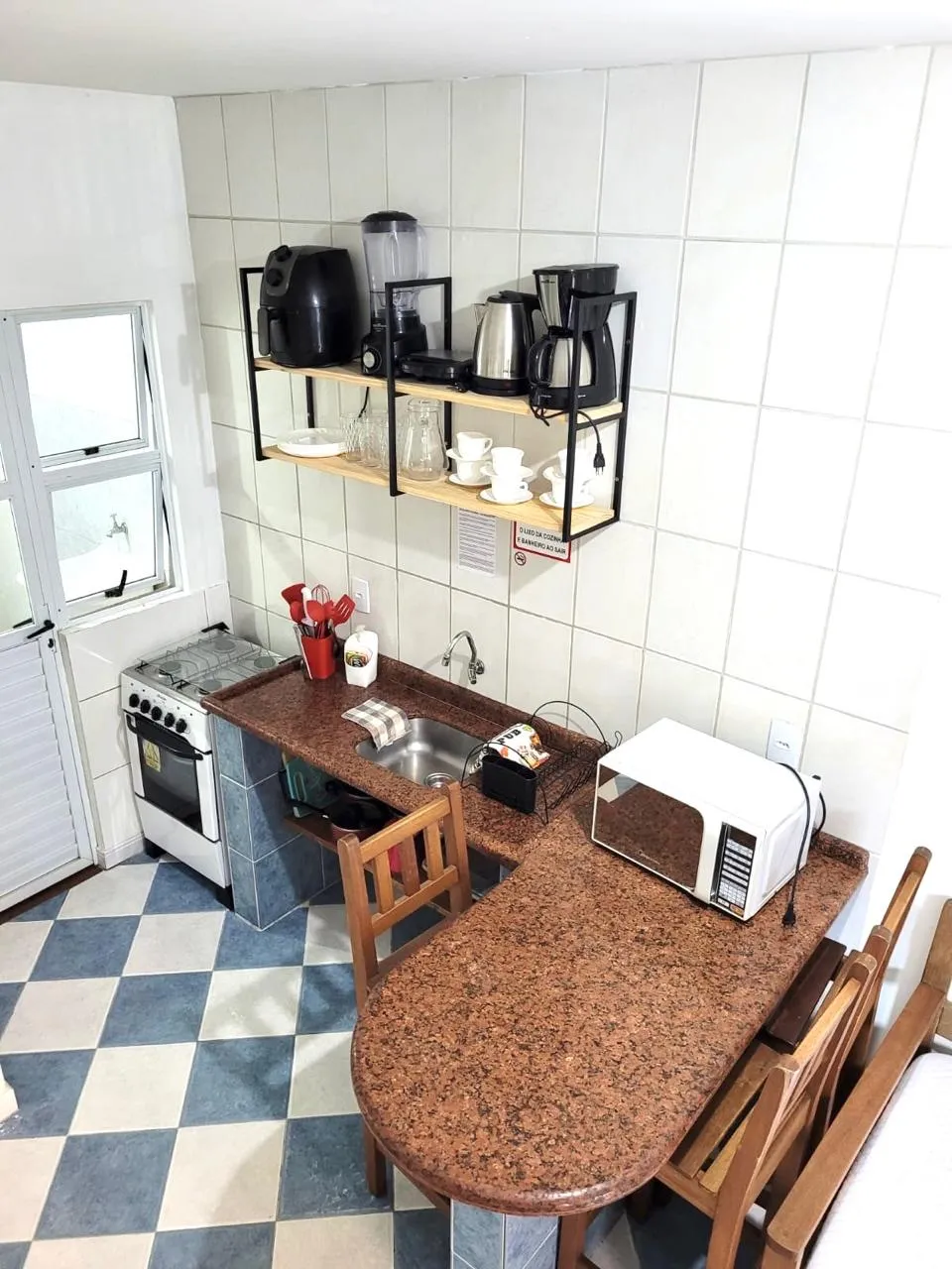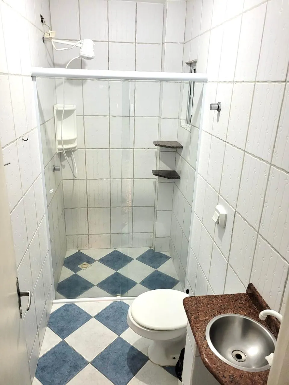 Térreo: sala ( sofá cama com 02 camas de solteiro, TV- LCD 32 pol. e parabólica, ventilador), cozinha( geladeira, fogão 4 bocas, armário, pia e mesa de granito, 05 banquetas de plástico, microondas, utensílios de cozinha), wc completo ( pia granito, box, ducha, vaso , espelho), churrasqueira individual (grelha), lavanderia (varal, tanque, vassoura pá, balde).
